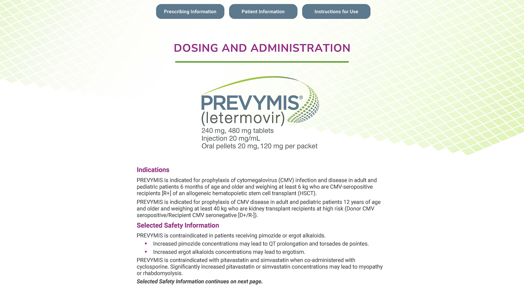 - Please see full Prescribing Information for proper preparation and administration of PREVYMIS IV infusion.